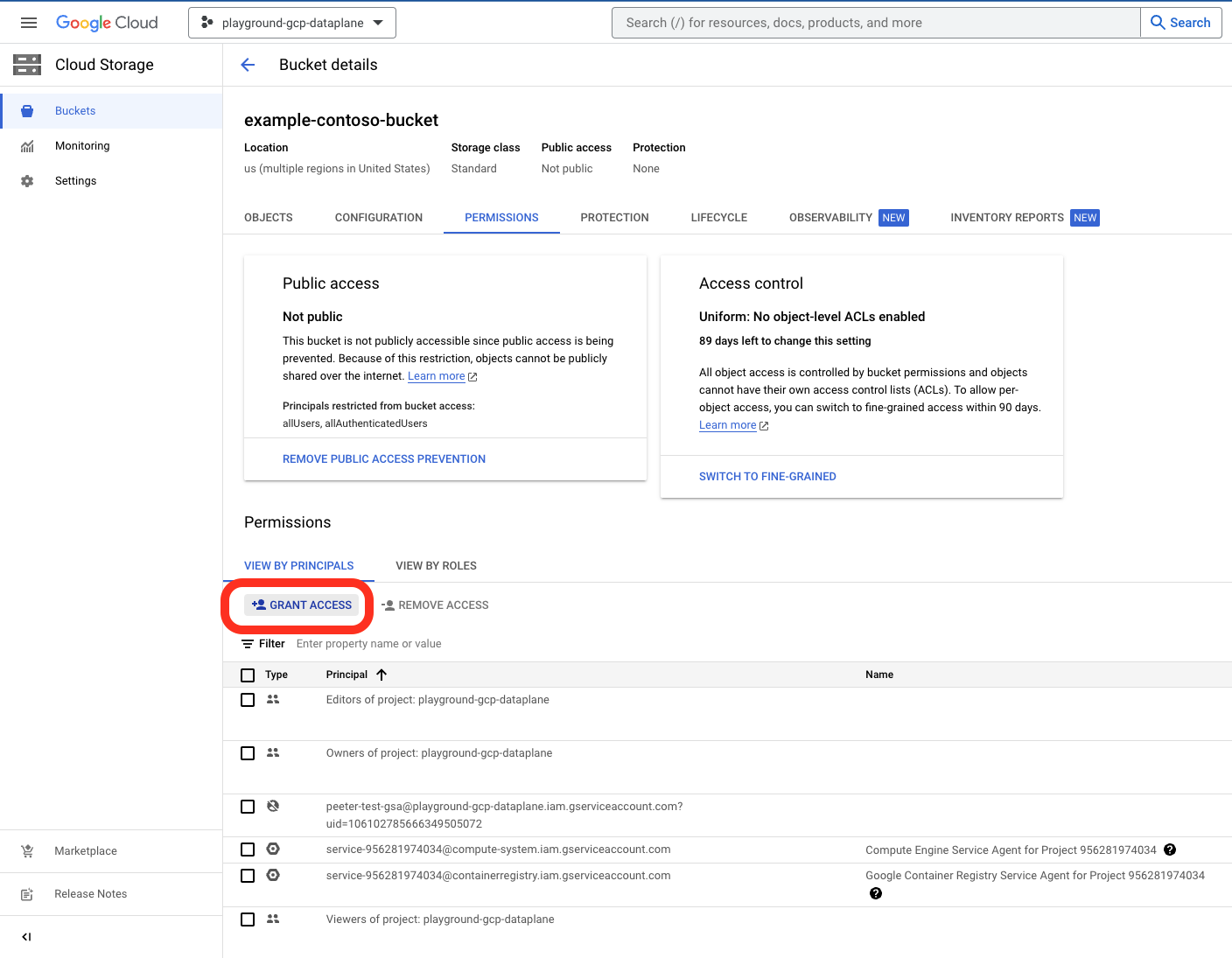 • Go to Cloud Storage > Buckets and select the bucket to which you want to grant access.